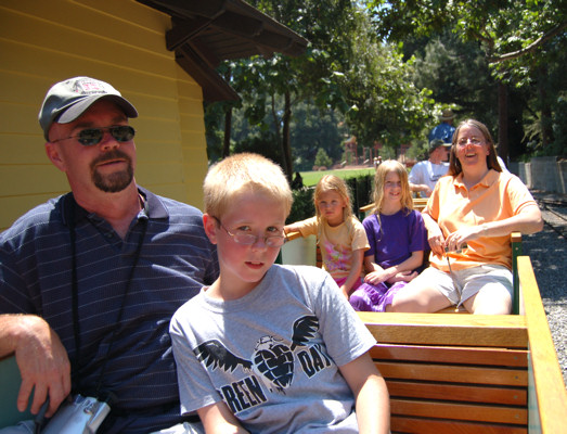 June 2006: Greg, Steven, Emily (in purple) and Nancy. (Kathleen Pindar is between them.) Taken on the steam train at Vassona Park, Los Gatos, CA. We were celebrating our parent's 50th wedding anniversary. |